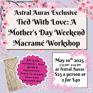 Celebrate creativity and connection this Mother’s Day weekend with a cozy, hands-on macramé workshop at Astral Auras! 💕 Whether you're treating yourself, crafting with Mom, or making a heartfelt gift, you'll enjoy step-by-step live instruction in a warm, welcoming space.